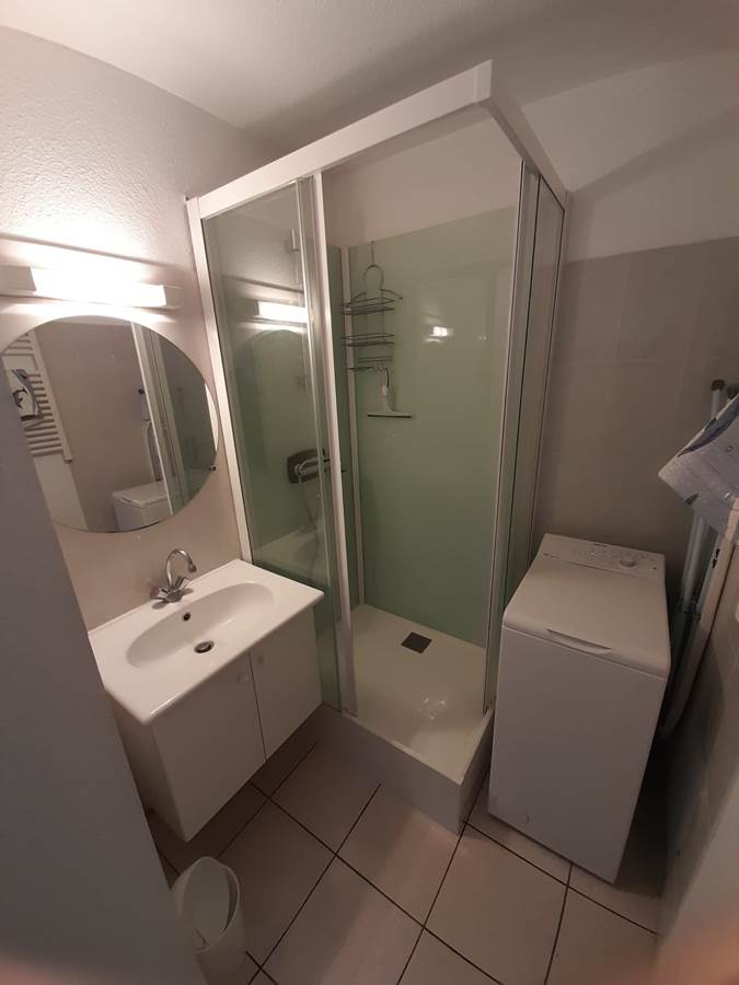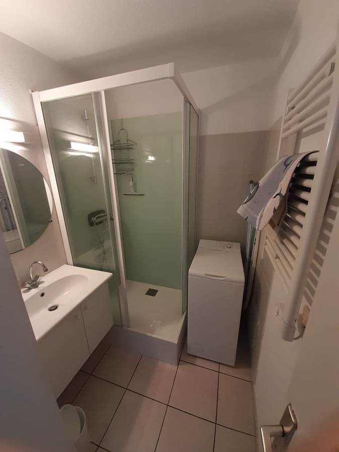 - Une salle d'eau moderne avec cabine de douche et lave-linge